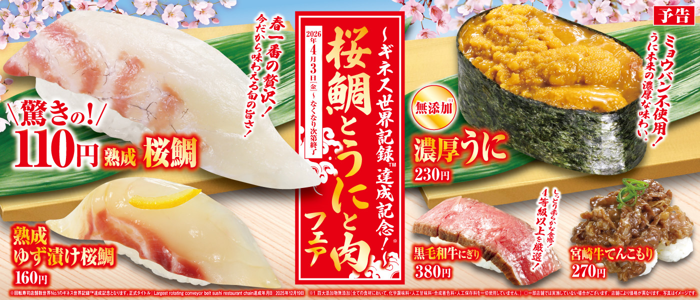 くら寿司から2026/03/31より期間限定で発売された「260403桜鯛とうにと肉フェア」に関する情報まとめです。 販売期間や取扱店舗、売り切れ状況などを確認して、ぜひ期間中に味わってみてください。 Eat-Nowでは、くら寿司の最新メニュー情報を地図情報とともに毎日更新してお届けしています。